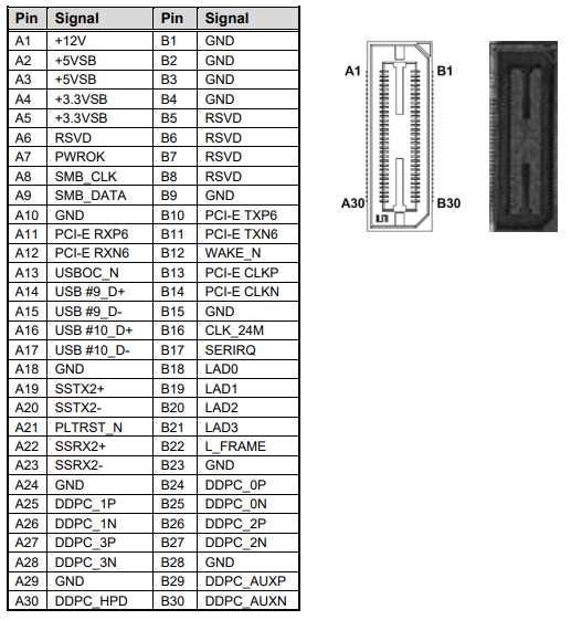 60-pin high speed connector; containing one PCI Express x1, one USB 2.0, one USB 3.0, one LPC and one SMBus.