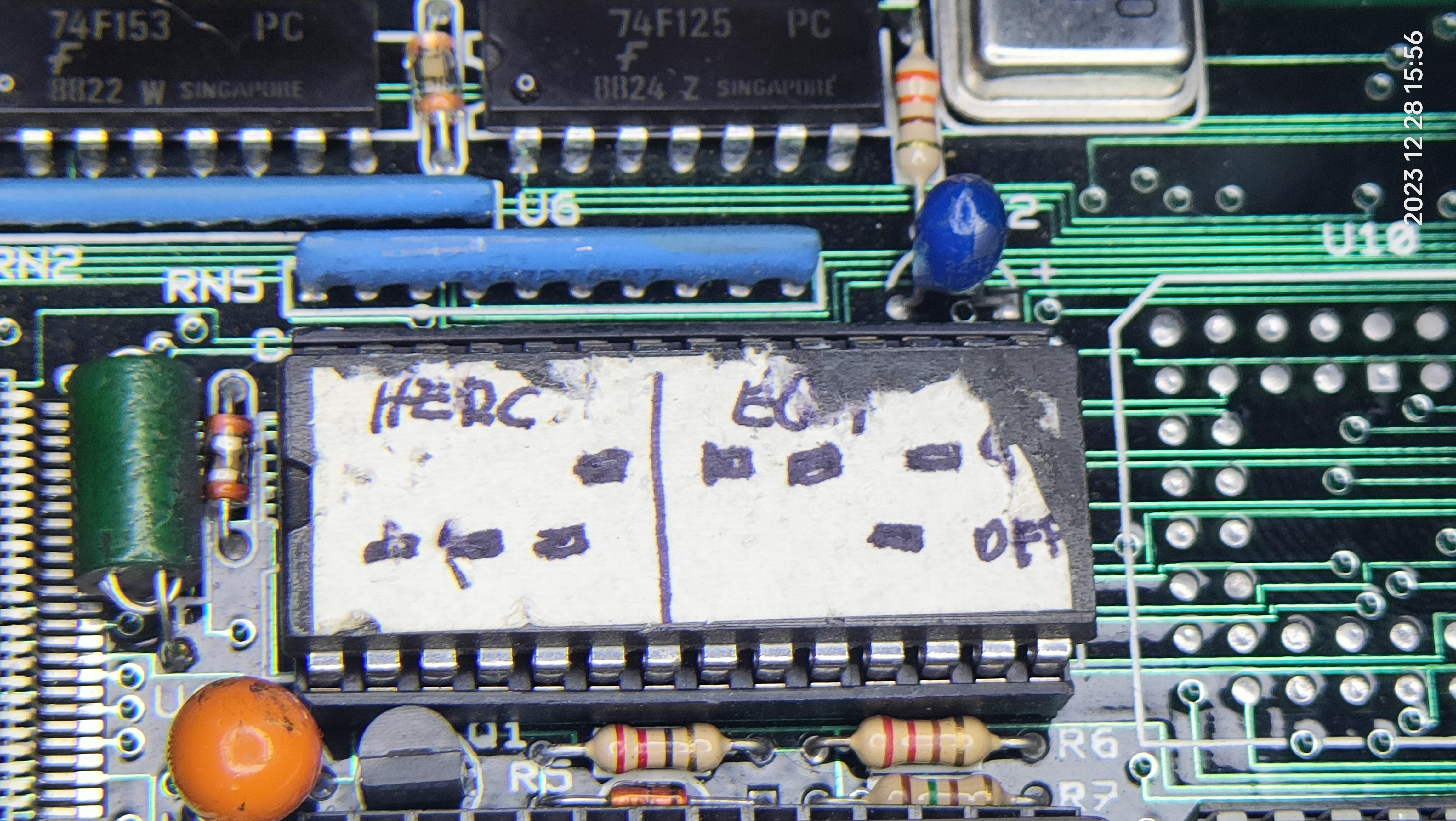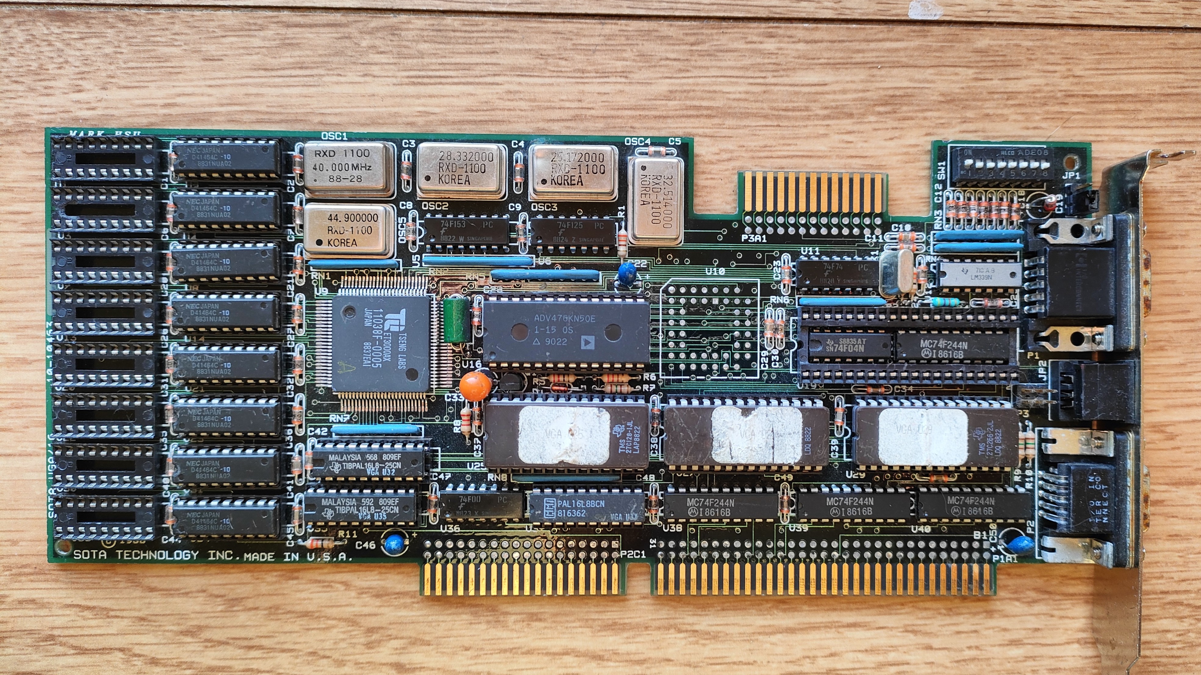 Note DIP switch photo for how to switch between Hercules and EGA mode. It is unknown which jumpers these indicate.