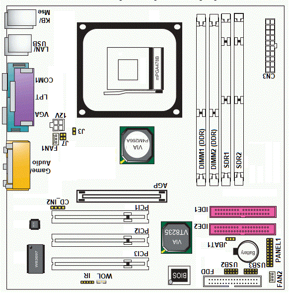 cannot use SDRAM and DDR at the same time. If using a 533MHz FSB CPU, must use PC133 SDRAM.