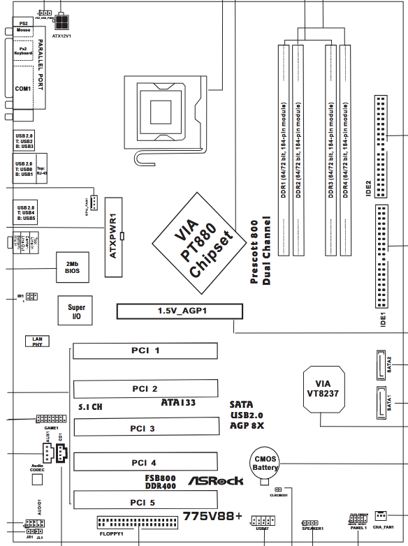 - 775V88 uses a VT8237/R southbridge.