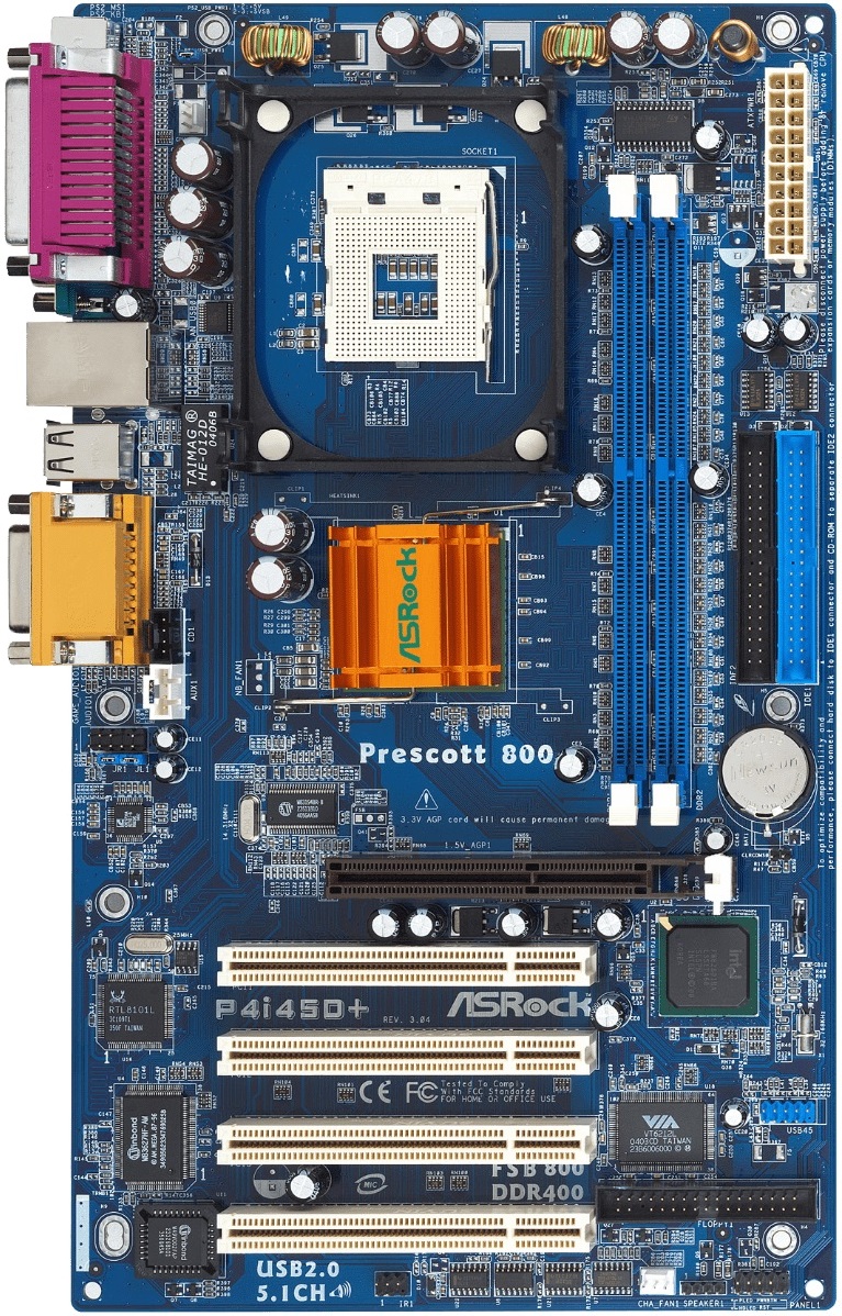 Revised version of P4i45D with Prescott support. Motherboard has USB 2.0 support via PCI VIA USB 2.0 controller. FSB 533/800 CPU Support via overclocking. Lacks P4 Power connector