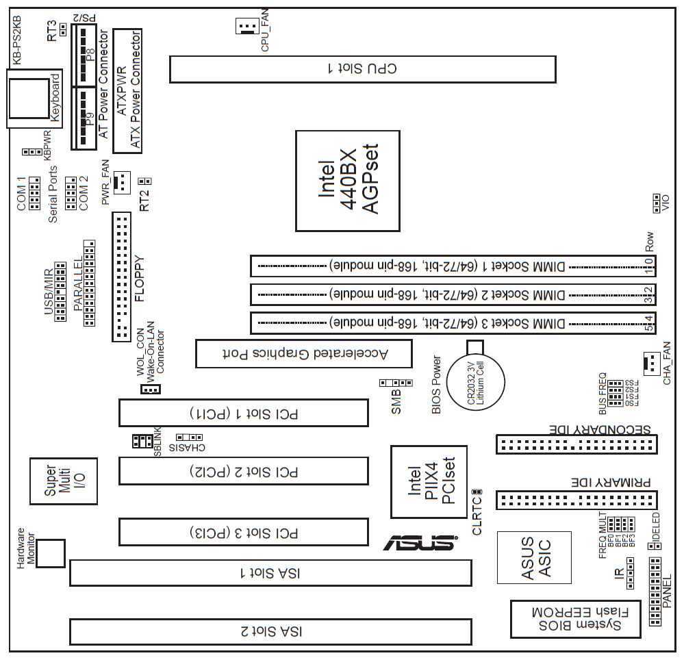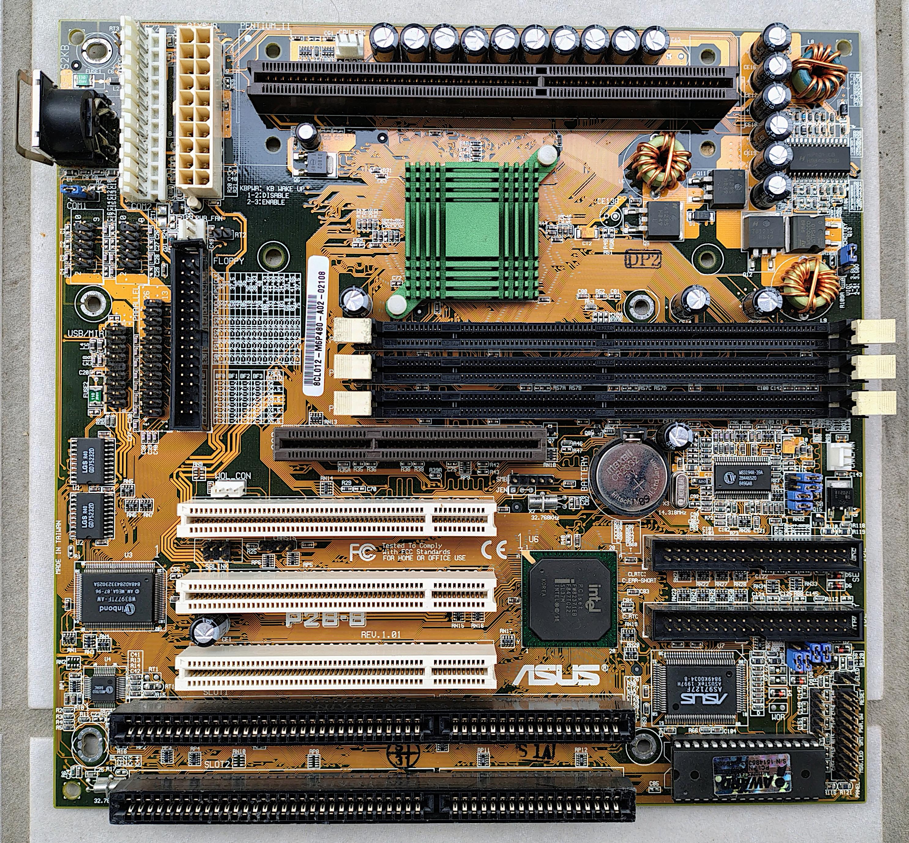 Unlike its P2B ATX sibling, this board ships with the JEN jumber hardwired for manual CPU multiplier and bus frequency.
