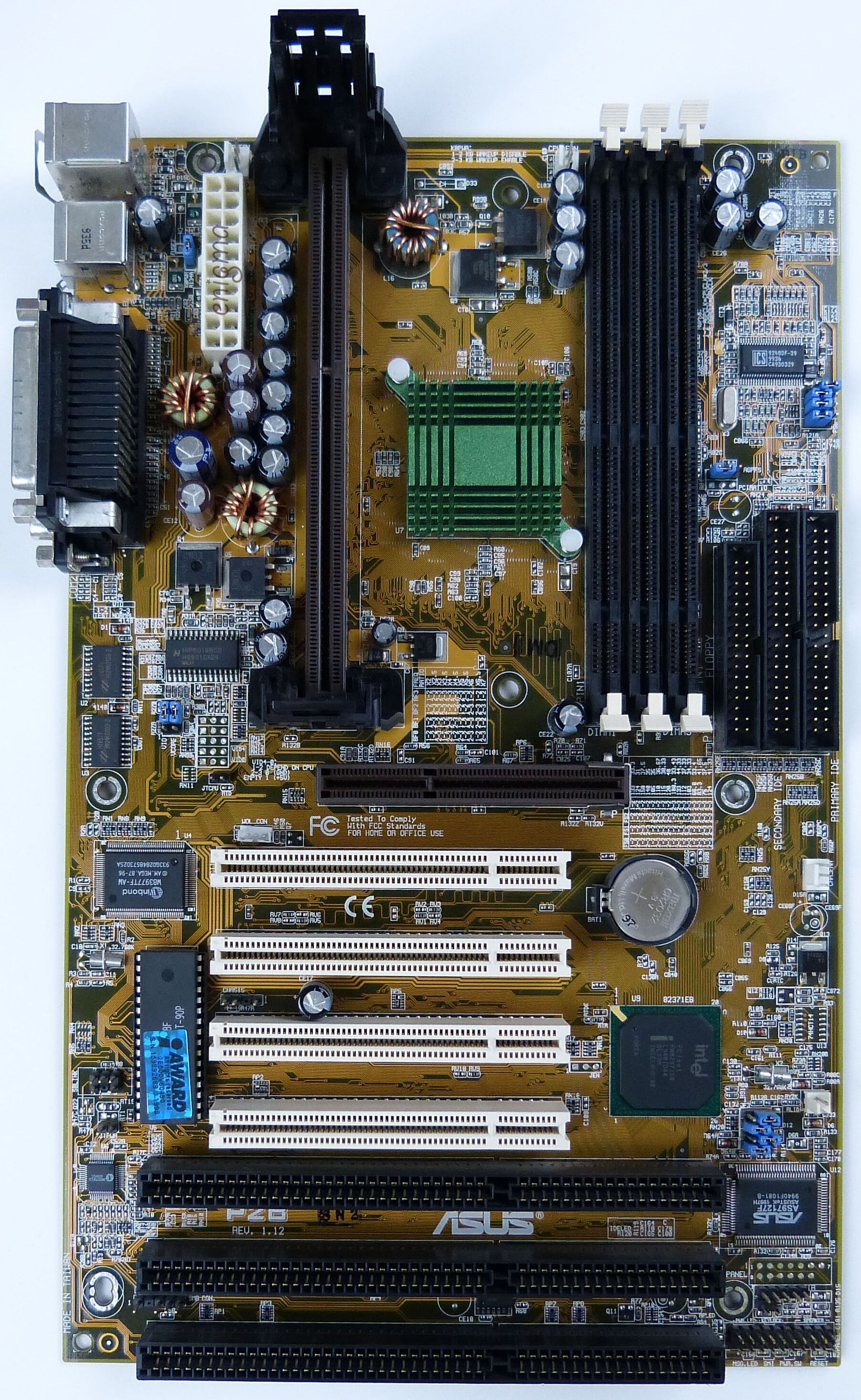 Last revision of the ASUS P2B, supports Coppermine Pentium III and Celeron. Socket 370 CPUs are officially supported with an Sloket. FSB 133 CPUs are supported via overclocking