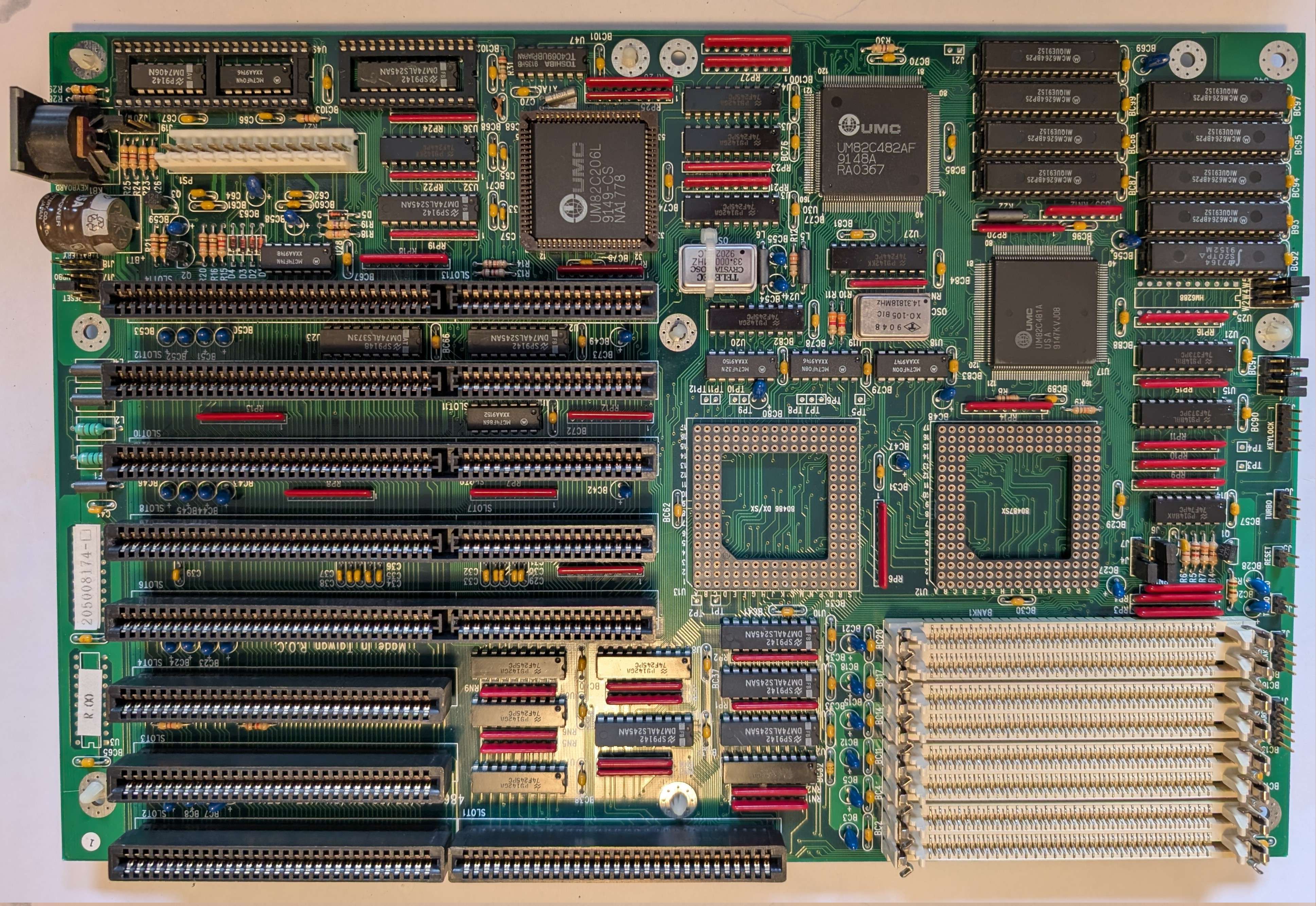 486SX: J6 2-3; J7 open 486DX: J6 1-2, 3-4; J7 closed JP7 open (default) runs the system bus at 1:1 the oscillator. With it closed, it runs at 1:2 the oscillator (divided in half) so a 32MHz osc gives 16MHz, etc.