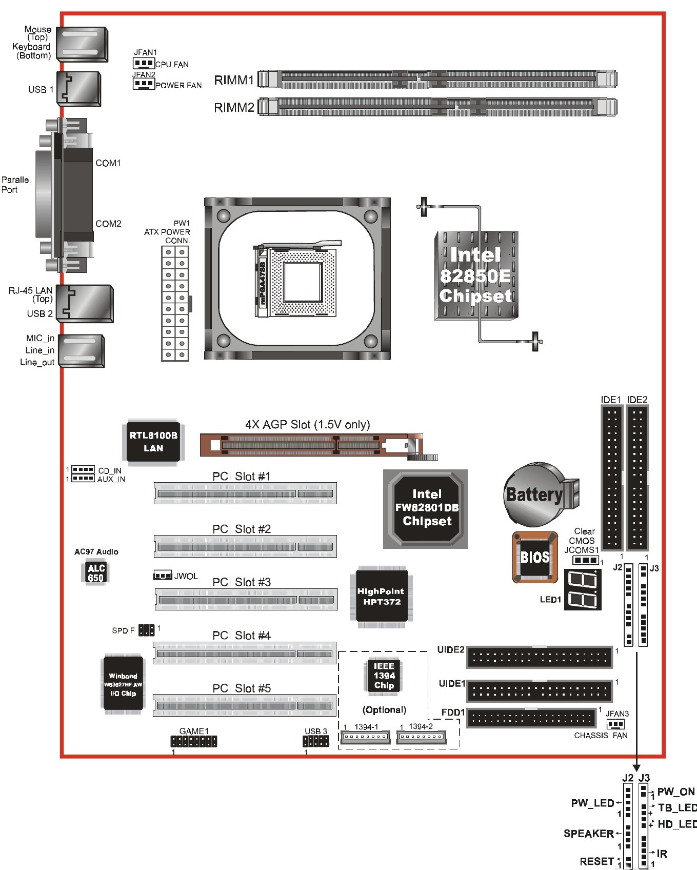 Unlike the vast majority of motherboards with Intel 850-series chipsets, this model utilizes the ICH4 southbridge.