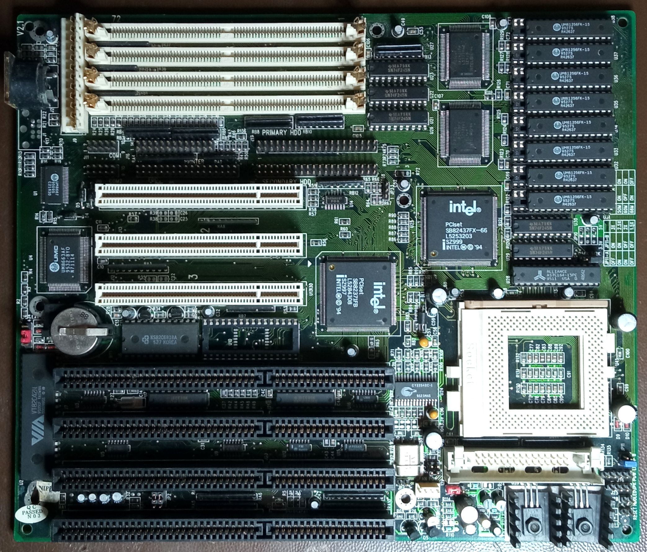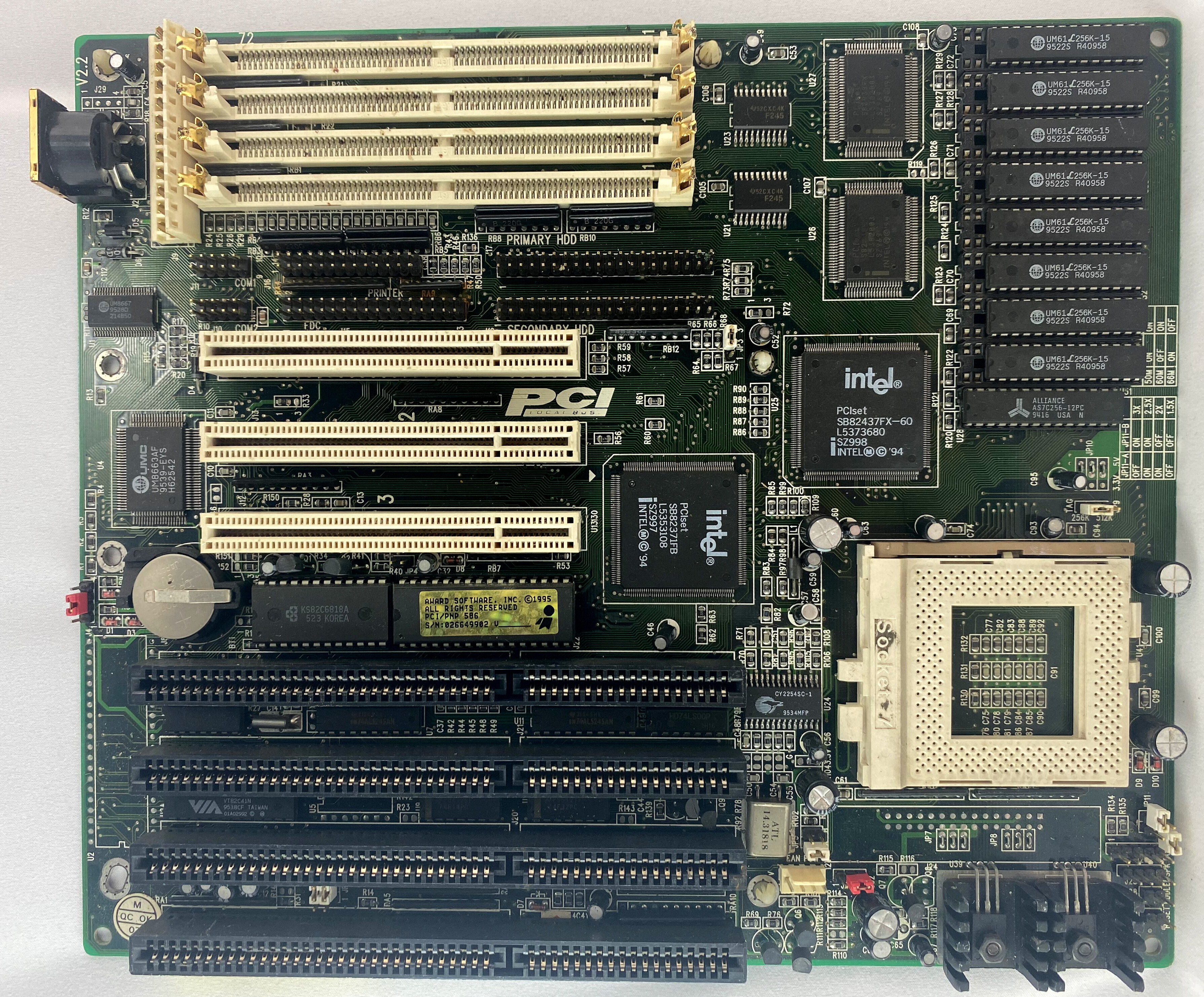 The motherboard may include a non-functional or counterfeit SRAM cache, which can adversely affect performance. Signs of fake cache often include soldered DIP-chips and no jumpers to set the chache size. Cache functionality can usually be restored by installing proper chips, jumpers and a BIOS update/mod.