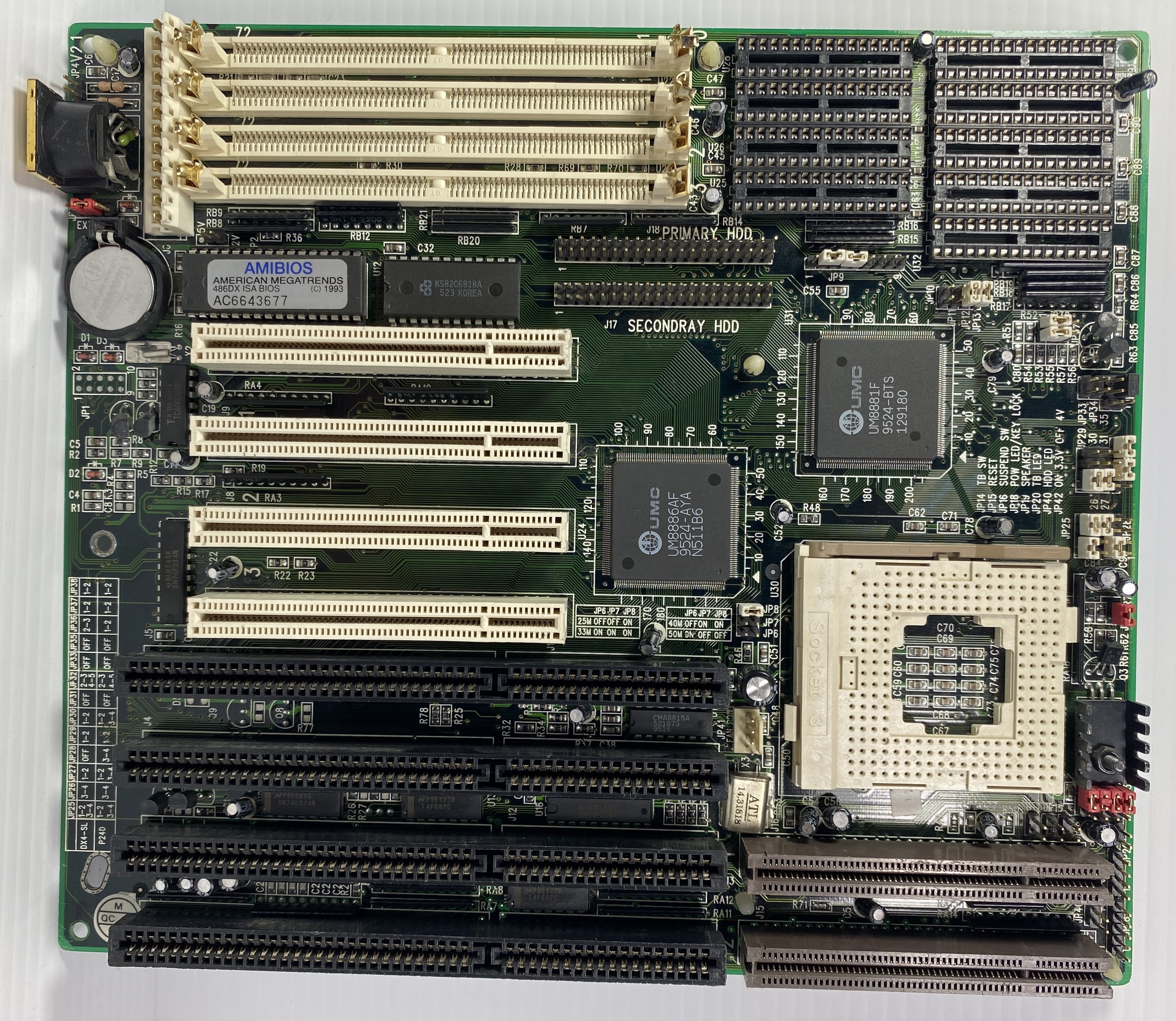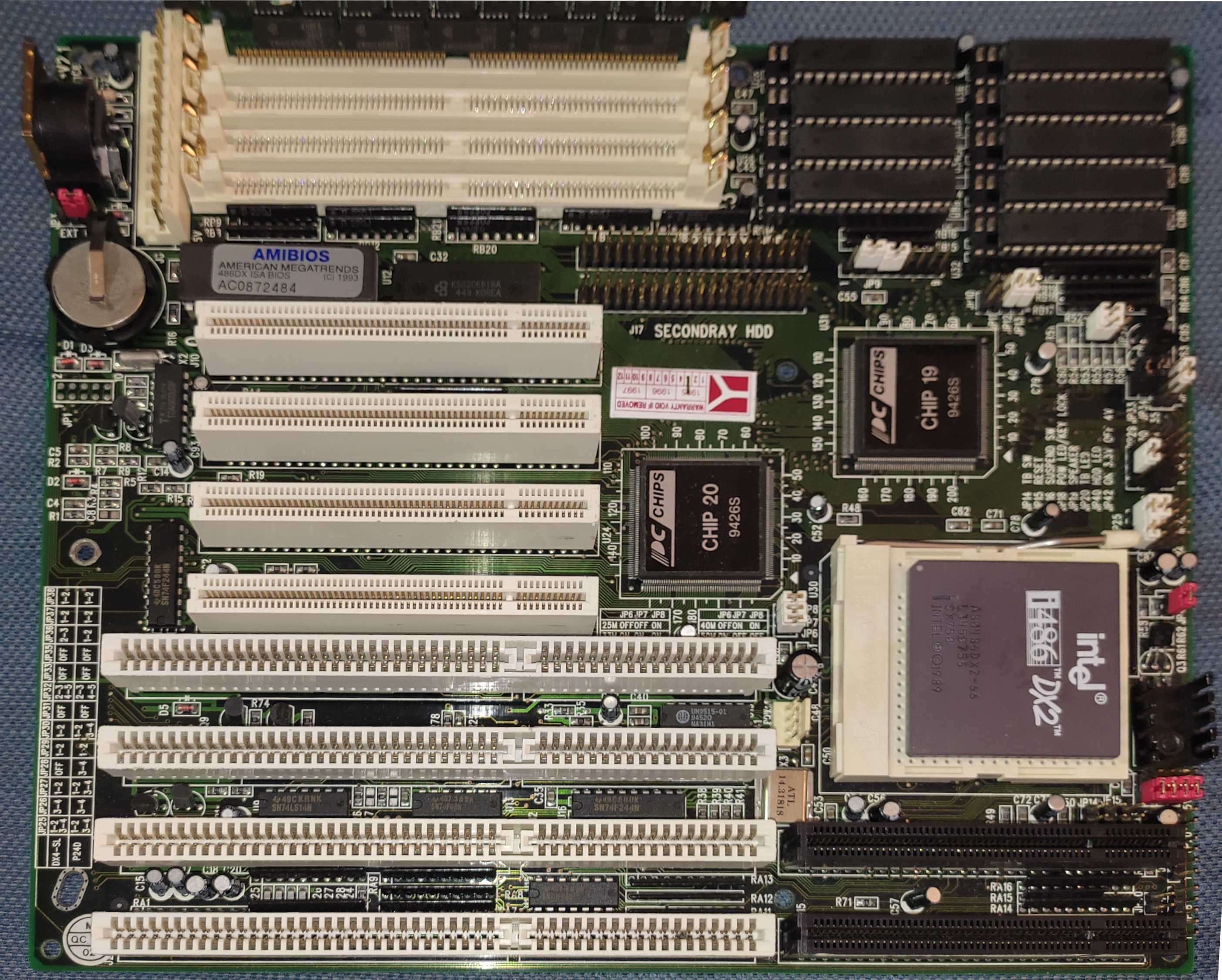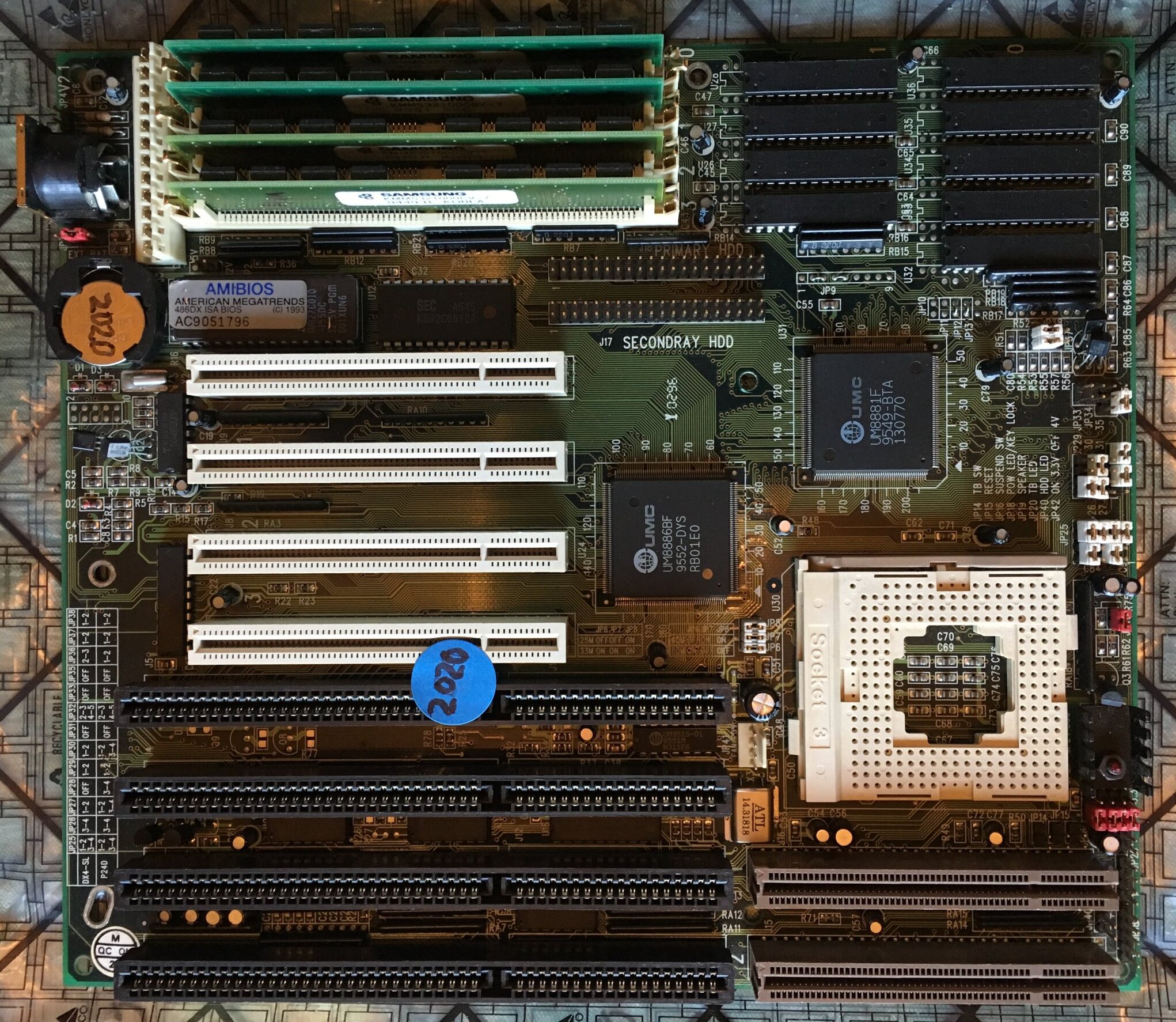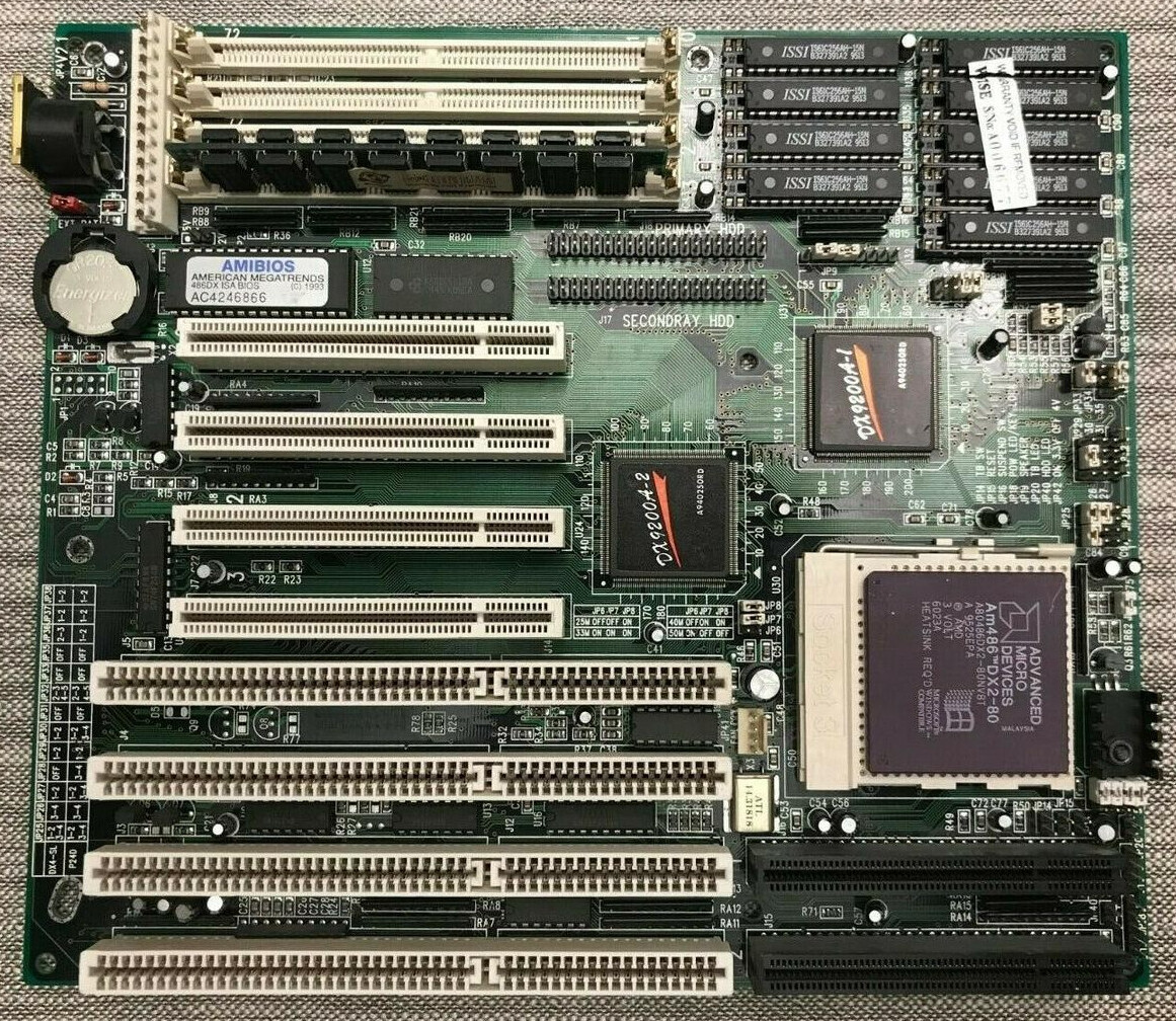 The motherboard may include a non-functional or counterfeit SRAM cache, which can adversely affect performance. Signs of fake cache often include soldered DIP-chips and no jumpers to set the chache size. Cache functionality can usually be restored by installing proper chips, jumpers and a BIOS update/mod.