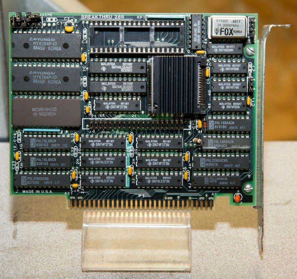 Accelerator card for 8088 machines. Uses ribbon cable to connect to 8088 socket to replace onboard CPU. Turbo switch on bracket switches between 8088 and 286 operation.